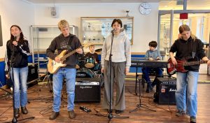 Musikalisch begleitet wurde das gemütliche Beisammensein bei Kaffee und Kuchen von der Schulband. Matti Heinemann (7c), Mathilda Müller (7e), Tobi Schneider (7e), Claas Henneberg (10K1), Liliana Herrlich (Q1) und Kim Braßat (Q2) sorgten mit ihren Stücken für eine fröhliche und entspannte Stimmung. Unterstützt wurden sie von Herrn Belter und Leif Wirnhier (Q1) an der Technik, die für einen reibungslosen Ablauf sorgten.