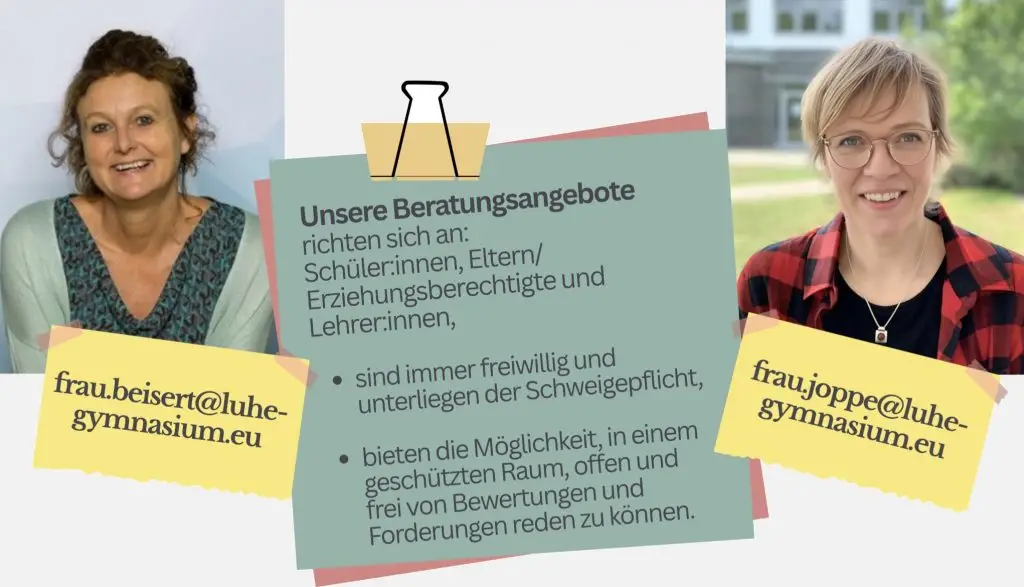- Hinzu kommen die Beratungsangebote der Beratungslehrerinnen Frau Beisert und Frau Joppe, dem SV-Verbindungslehrer Herr Lewing, Lehrerinnen mit beratungsbezogenen Zusatzqualifikationen wie Frau Marksteder (sozialpädagogisches Studium), den Mediatorinnen Frau Badurczik, Frau Jaeckel, Frau Joppe, Frau Röhlke.