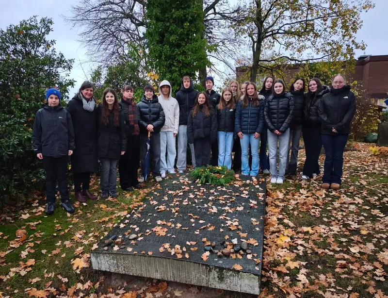Am 14. November 2025 haben wir Religionsschüler*innen des 10. Jahrgangs gemeinsam mit Pastorin Koehn und dem Bürgermeister Herrn Wiese an das schreckliche Geschehen der Reichspogromnacht am 9./10. November 1938 gedacht.