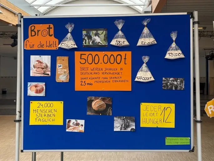 Auf unserem Plakat im Forum zeigen wir, dass in Deutschland jährlich 500.000 Tonnen Mehl, Brot und weitere Backwaren verschwendet werden, welche man stattdessen hätte spenden können, um den Hunger in der Welt zu lindern.